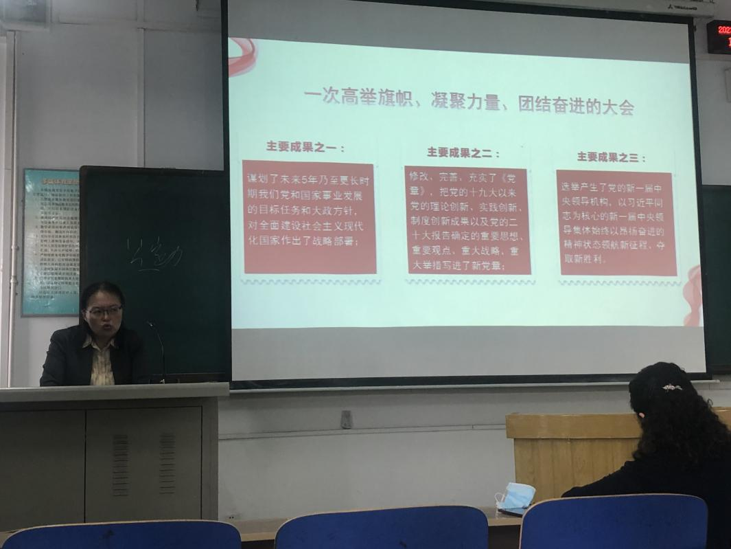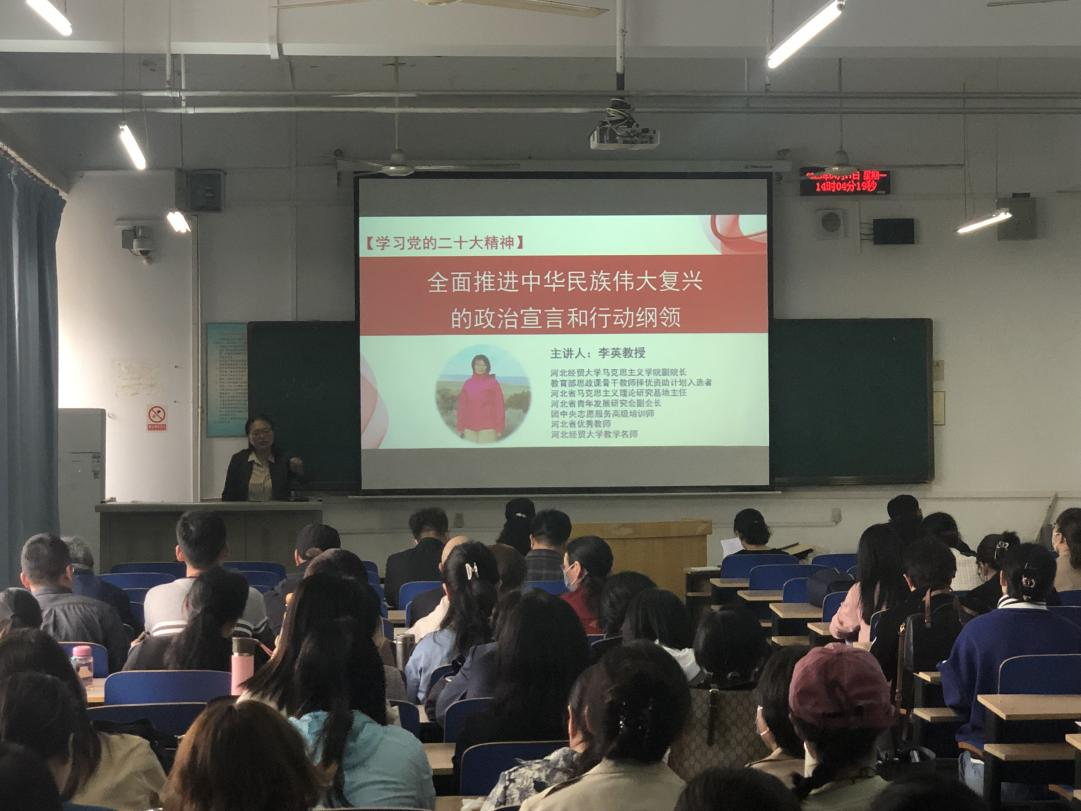邀请马克思主义学院副院长李英教授进行党的二十大精神宣讲,讲座题目是:全面推进中华民族伟大复兴的政治宣言和行动纲领。讲座由黑料不打烊