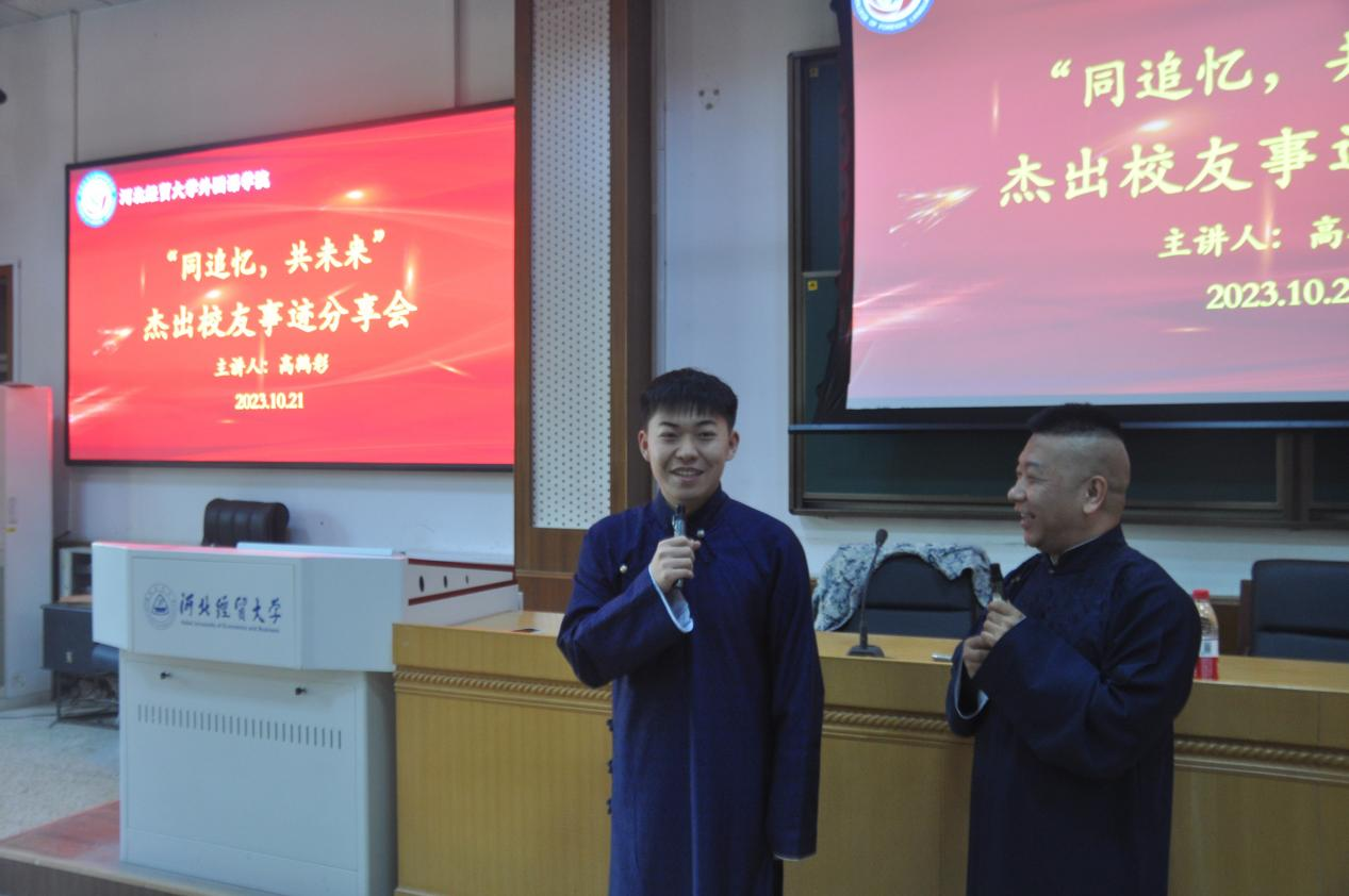 高鹤彩首先对母校建校七十周年表示诚挚的祝贺,对老师和同学们致以亲切的问候。在分享会上,高鹤彩讲述了他从一名公务员转型成为一名专业相声演员的心路历程,由此鼓励同学们在成长的过程中要不断探索自己、发现自己,在专业学习中要准确把握自己的职业兴趣、性格特点以及优势、能力,确立适合自己的职业生涯目标。高鹤彩结合自身经历,给同学们提出了三点建议:一是人生没有极限,人生也没有定义,找准方向,努力发展自我、超越自我;二是成大事者,必懂感恩。同学们在成长的过程中要时刻怀有感恩之心,爱母校、爱师长、爱家人、爱朋友;三是人生不如意事十之八九,越是困难越要坚持初心迎难而上,走过最窄的路,将会迎来最亮的光。发言结束后,高鹤彩还与弟子方佳炜一起即兴表演了一段精彩的原创相声。