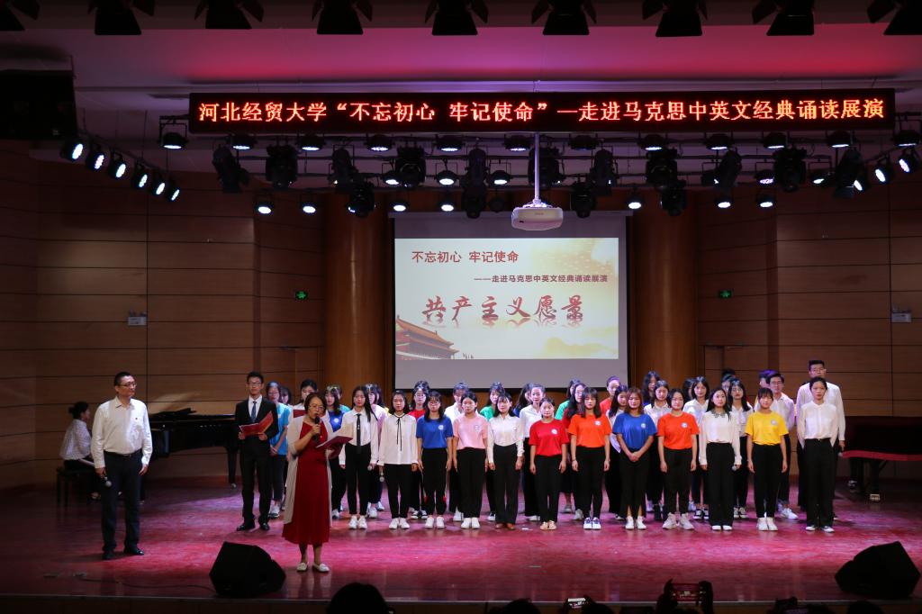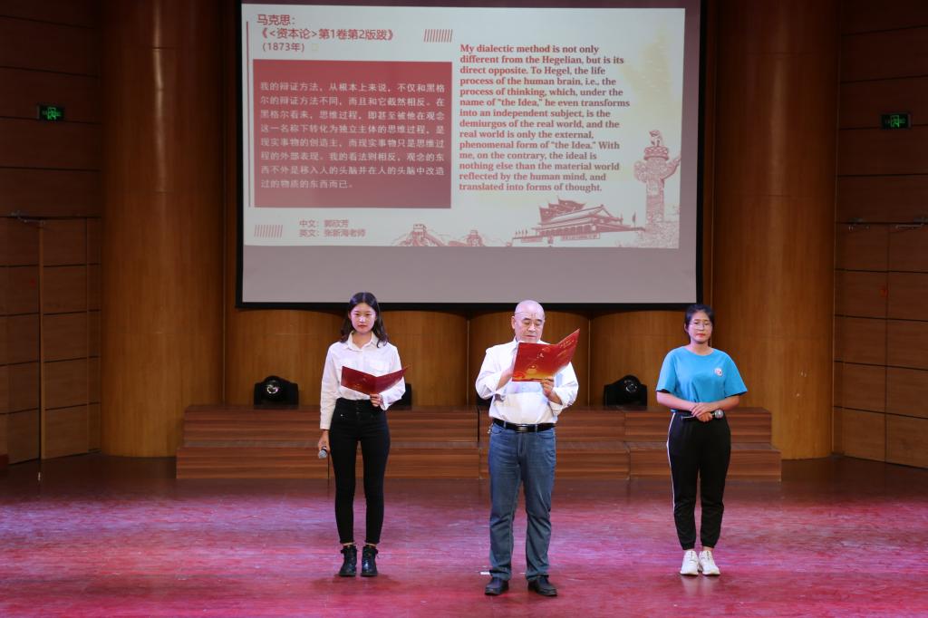 教师安岩、张新海、邵黎明等带领学生用纯正英语进行精彩诵读,师生党员、积极分子声情并茂的表现,为大家带来一场精神盛宴。一幅幅画面,一段段文字,深深地打动了在场的每一位师生,大家仿佛走进了马克思生活的那个年代,与他的思想一同起舞,在反思与批判中感受精神的力量。当进行到“无产阶级的历史使命”一章时,刘建平副书记走上舞台,带领广大师生共同合唱国际歌,激情的歌声尽显无产阶级的战斗豪情和实现共产主义理想的坚强决心。在高昂的歌声中本次活动画上了圆满的记号。