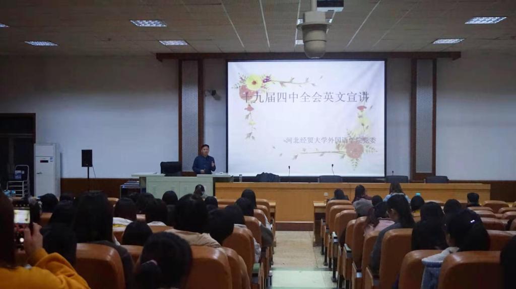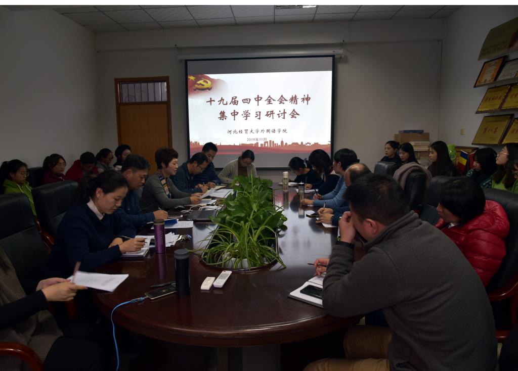 集中学习传达党的十九届四中全会精神。学院班子成员,全体行政人员、教师代表及英语专业学生近300人参加。
