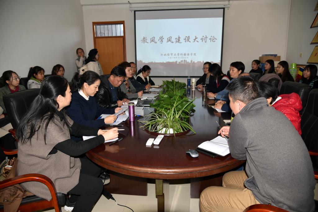 在学院会议室开展教风学风建设大讨论活动。学院班子成员、辅导员、教师及各年级各专业学生代表参加。会议由学院党委书记刘会娟主持。