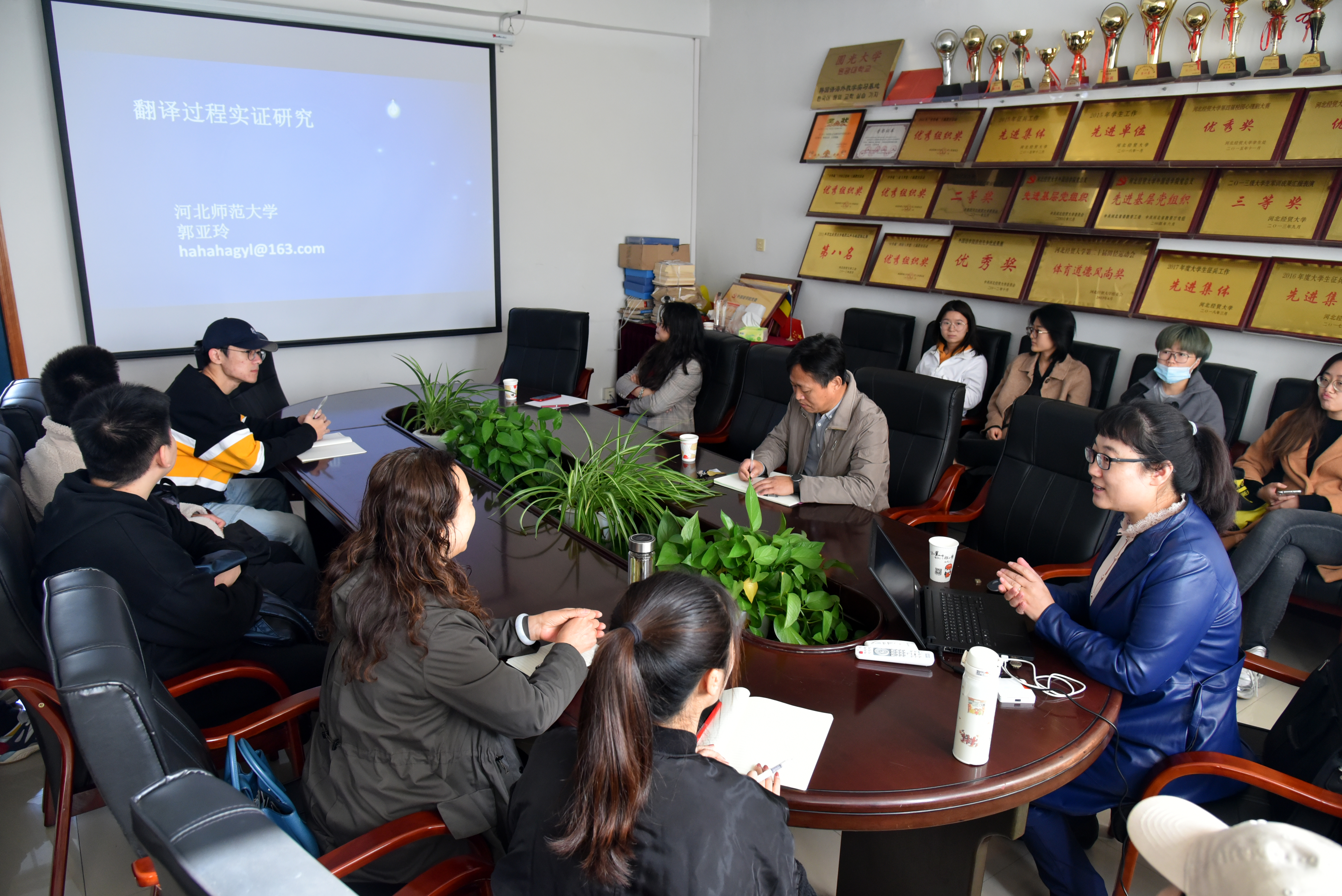 ,为MTI研究生做了《翻译过程实证研究》的学术报告。郭雅玲老师是北京外国语大学博士,河北师范大学翻译专业研究生导师,曾任教于香港中文大学(深圳)人文学院,在美国加州州立大学和澳门大学短期访学。