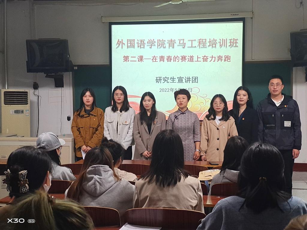 6名党员研究生组成的英文宣讲团,以“在青春的赛道上奋力奔跑”为题进行专题宣讲。60余名青马学员现场聆听,宣讲会由学院党委书记刘会娟主持。