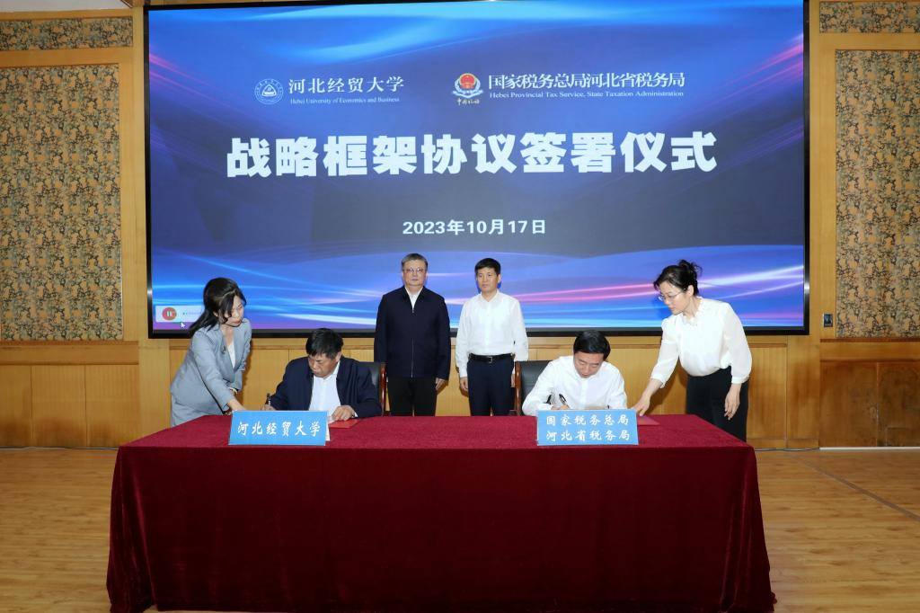 建校70周年表示热烈祝贺。他指出,签署战略合作框架协议是双方进一步深化合作的重大举措,是推进税务部门与学界对接的一项积极行动,为双方共谋发展、共赢未来拉开了新的序幕。希望以此次战略合作为契机,整合双方资源,发挥各自优势,在党建统领、人才培养、政策研究、学生实习、以税资政等方面开展深度合作,培养出更多适应新时代税收事业发展的高素质、高层次、应用型、复合型税务人才,为税收现代化服务中国式现代化建设河北篇章作出积极贡献。