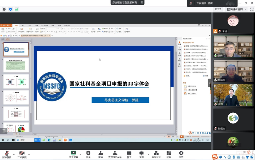 马克思主义学院郭建教授做国家社科基金课题申报专题讲座,讲座由杨清珍副院长主持,张润院长出席并做最后总结,外院师生50余人参加。